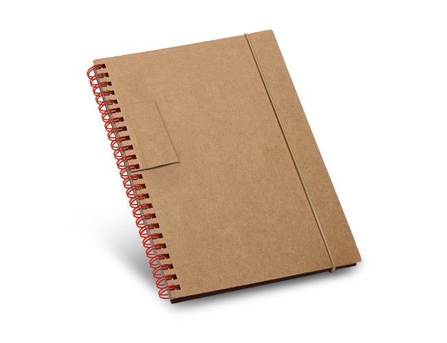Caderno B6 espiral com 60 folhas pautadas de papel reciclado e capa dura em cartão com suporte para esferográfica.