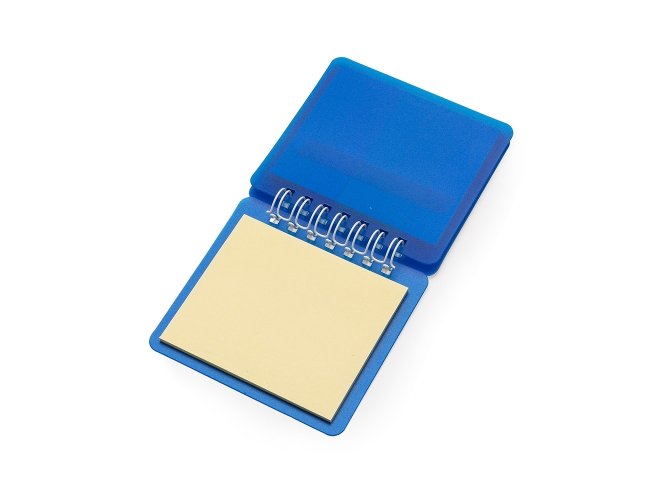 Bloco de anotações plástico com autoadesivos e wire-o, contém cinco blocos autoadesivos coloridos com aproximadamente 25 folhas cada.