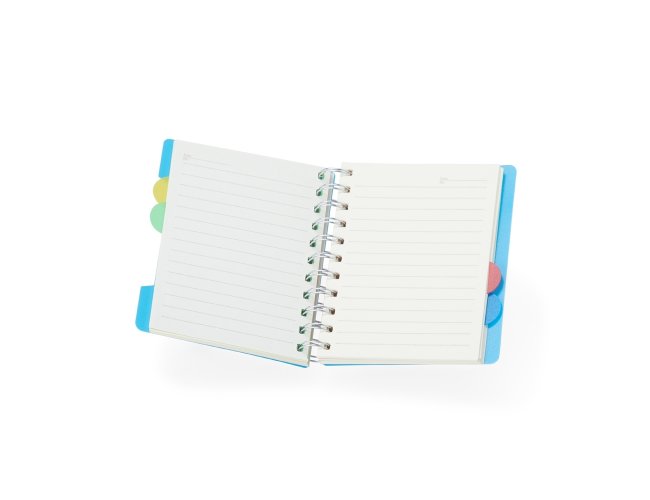 Caderno pequeno com 4 divisórias e abas para identificações, capa plástica com wire-o metálico.