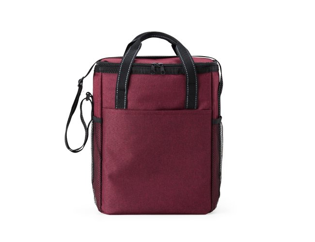 Bolsa térmica de poliéster de 16 litros com bolso frontal e bolsos laterais de nylon.