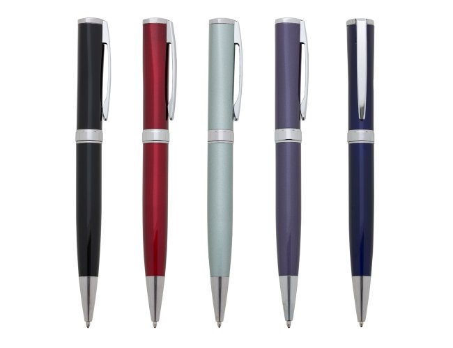 Caneta metálica com carga esferográfica azul e acionamento por rotação.