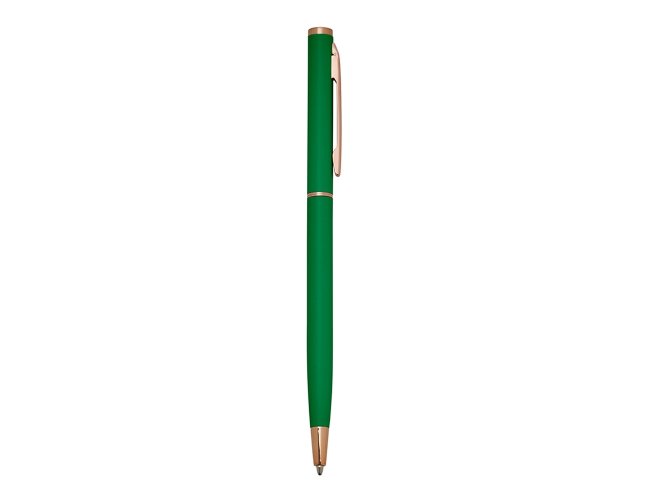 Caneta metálica com carga esferográfica azul e acionamento por rotação.