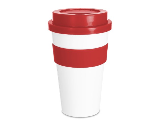 Copo plástico 450ml com tampa. Produzido em polipropileno e livre de BPA, o copo possui uma luva de silicone (removível) que impede a transferência de altas temperaturas, protegendo o usuário de queimar as mãos ao segurá-lo. Sua tampa com abertura de bocal é prática para ingestão de bebidas e evita o derramamento durante o transporte. Pode ser levado ao micro-ondas e lava-louças.