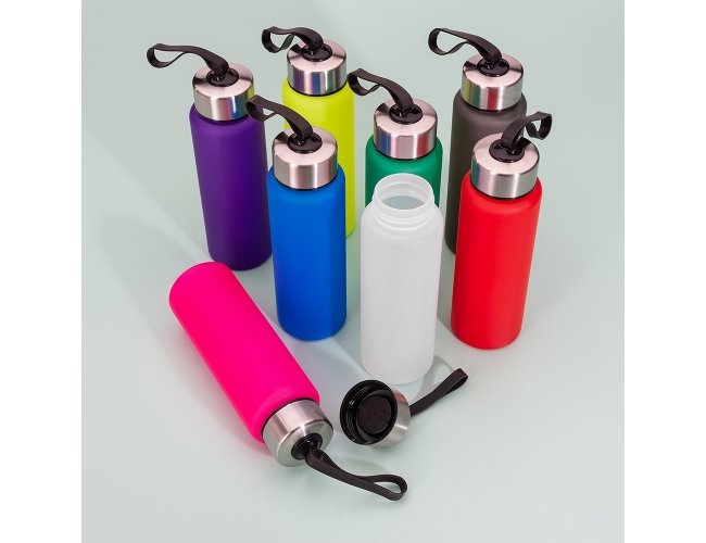 Garrafa 650ml em inox com tampa rosqueável com alça para transporte.
