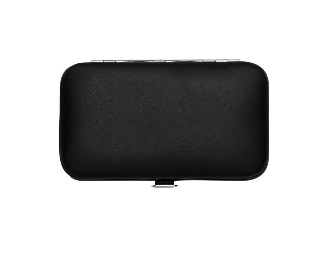 Possui: lixa, pinça, empurrador de cutícula, cortador de cutícula, tesoura e cortador de unha. Parte interna de plástico com suporte de couro para fixar as peças. Para abrir o estojo basta apertar o botão central.