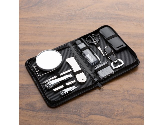 Possui: removedor de pelos, abridor saca rolha, tesoura, aparelho de barbear, lâminas para barba(3 unidades), escova de dente, pente, cortador de cutícula, mini kit unha 3 em 1(empurrador de cutícula, lixa, limpador de unha), cortador de unha, pinça e espelho duplo com aumento.