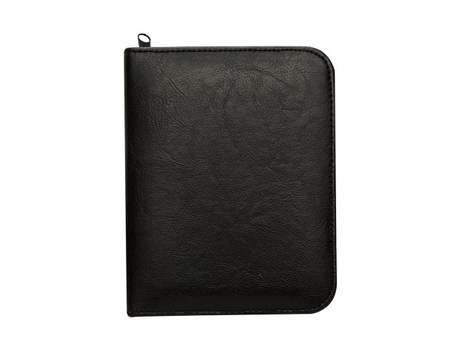 Kit masculino 12 peças em estojo de couro sintético, parte interna revestida com plástico em relevo e elástico para fixação dos itens.