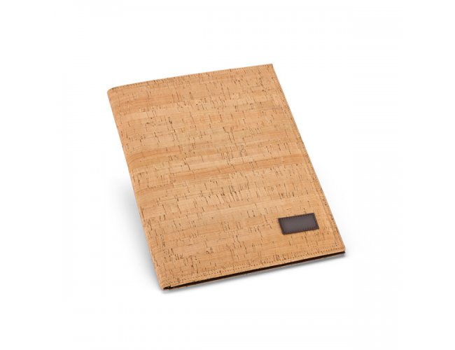 Pasta A4. Cortiça. Bloco: 20 folhas não pautadas cor marfim. Fornecida em embalagem de non-woven. Esferográfica não inclusa. 230 x 320 x 20 mm | Embalagem: 285 x 350 mm.