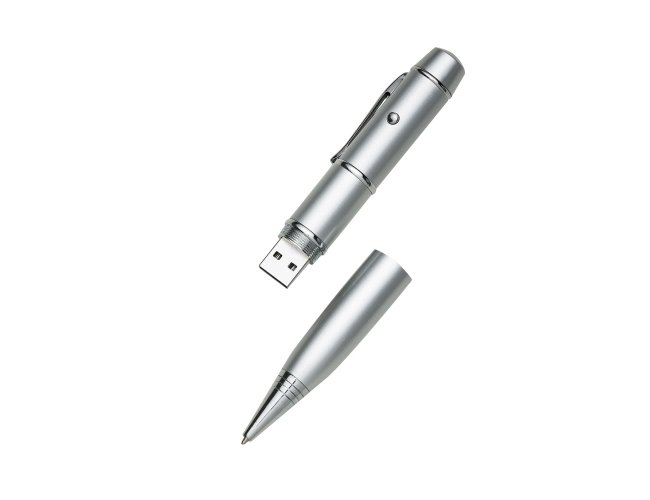 Caneta pen drive metálica com laser e esferográfica. Clip de metal e botão do laser com lacre, ao desrosquear anel abaixo do clip abre compartimento das baterias(acompanha 3 LR1130) e ao desrosquear o anel abaixo abre compartimento do pen drive. Para utilizar a esferográfica basta rotacionar a ponteira.