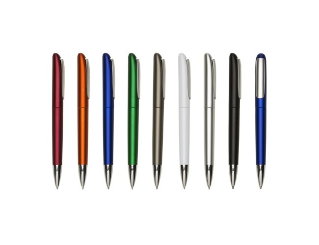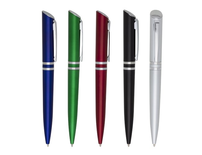 Caneta plástica com carga esferográfica azul e acionamento por rotação.