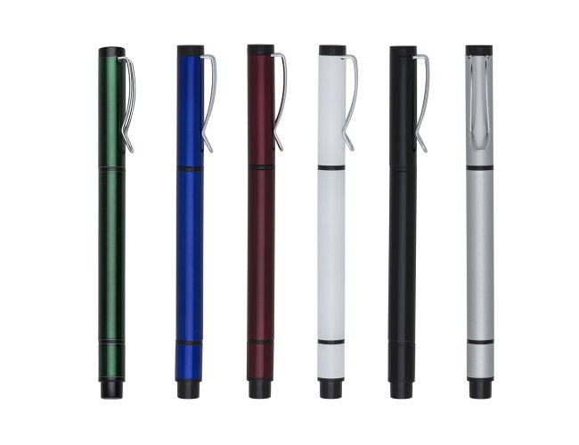 Conjunto de canetas roller e esferográfica em alumínio. Clipe em ferro com cromagem brilhante. Corpo laqueado com revestimento mate.