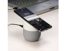 Caixinha de Som bluetooth com carregador por indução. Produzido em material plástico, a caixinha possui antiderrapantes