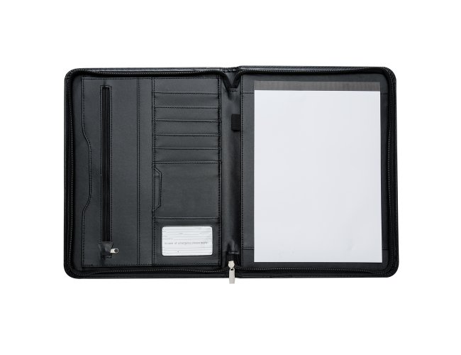 Kit para anotações em couro sintético com autoadesivos e caneta plástica.